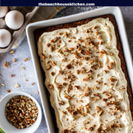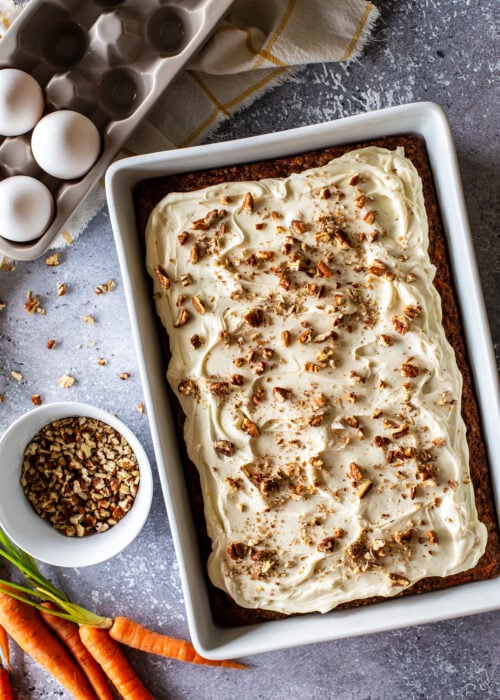 It’s made in a 9×13 baking dish, so it’s a quick and easy bake, as well as super simple to frost.
