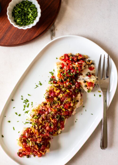 I really enjoy the robust flavor of the topping. It really elevates the flavor of any mild fish. I usually opt to serve my fish with a side of green beans and a chilled glass of white wine. It’s such a light, healthy dinner.