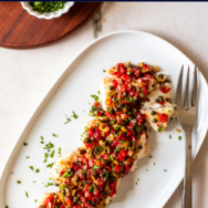 The third step is to top your fillets with your pico de gallo mixture. You’ll place the fish in a 400 degree oven until the fish is cooked through (145 degrees internal temperature) and flakes easily with a fork, about 15-18 minutes. Remove from the oven to a platter and sprinkle with your fresh chopped parsley.