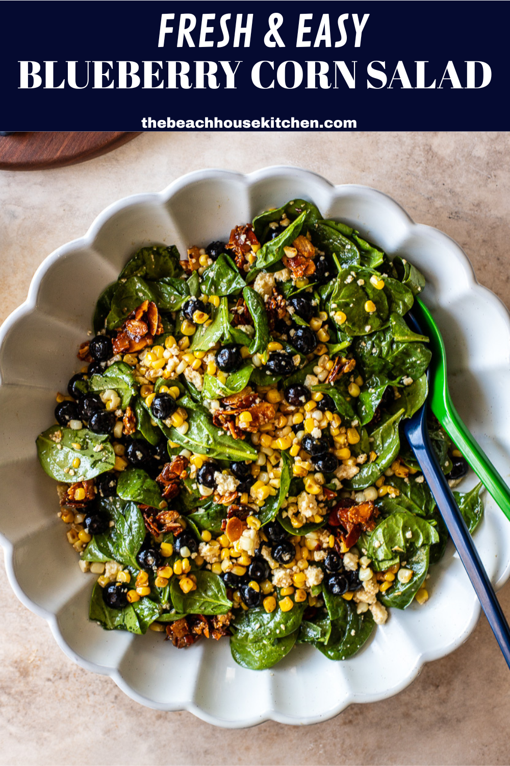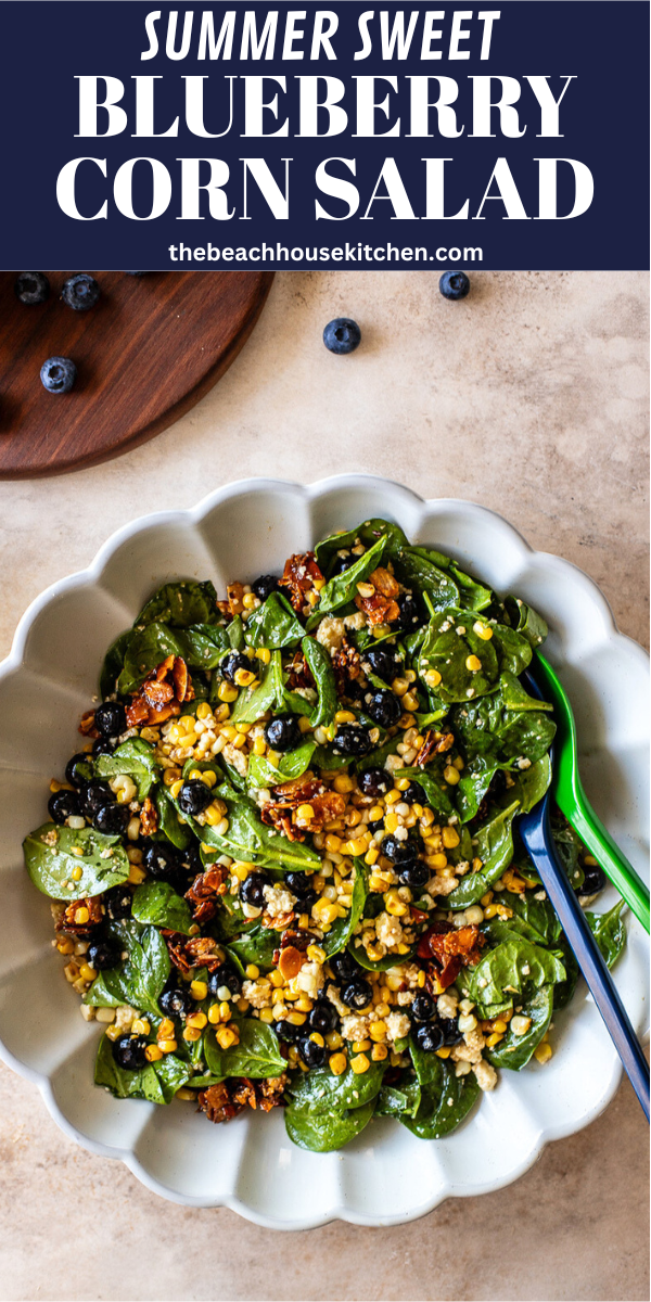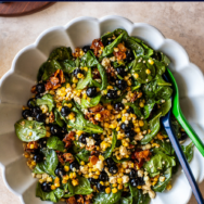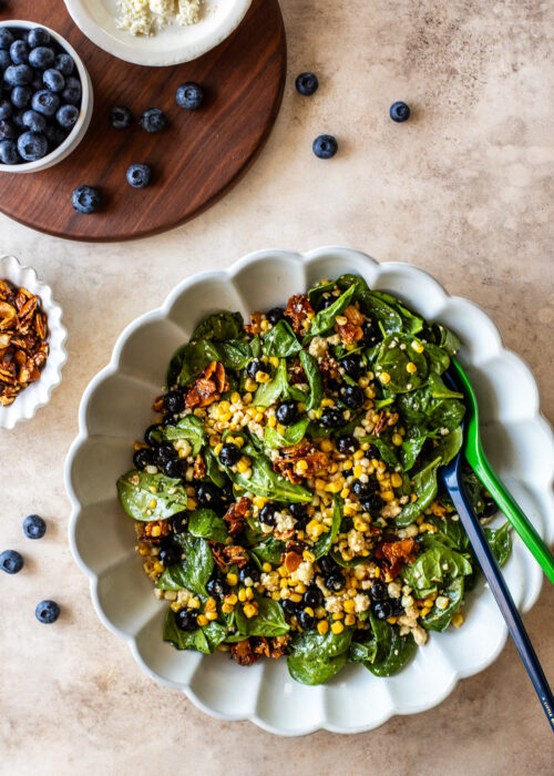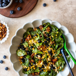 This Blueberry Corn Salad is a seasonally sensational summer salad! Loaded with plump, juicy blueberries, corn, spinach leaves, candied almonds and some salty cotija cheese, this salad is a family and friend favorite!
