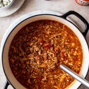 - Add your shredded chicken and continue to cook at a simmer until heated through. Season to taste with salt and pepper. Serve in bowls topped with crumbled blue cheese, shredded cheese, avocado and/or tortilla chips, if desired.