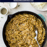 This French Onion Orzo is a twist on the classic French Onion Soup. It’s delicious served as a side with a nice juicy steak or as a vegetarian main dish. It’s comfort food that’s always a hit with family and friends!