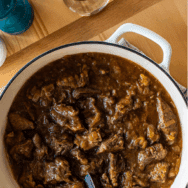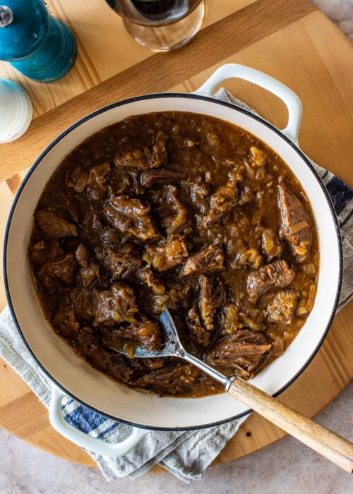 Once it’s done cooking you’ll remove the meat from the pot and shred it with two forks. Before I put the meat back into the gravy, I like to skim the fat from the top of the gravy and then thicken the gravy a bit with a cornstarch slurry. You’ll mix two tablespoons of cornstarch with a few spoonfuls of the gravy and whisk until smooth before whisking back into the gravy.