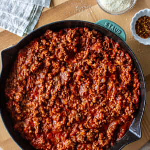 The first step is to cook your ground beef, Italian sausage, yellow onion, salt and pepper in a larger skillet over medium-high heat, breaking the meat up as it cooks and it’s no longer pink and the onions are translucent. You’ll drain the excess fat/liquid from the skillet and then mix in your minced garlic and cook for an additional minute.