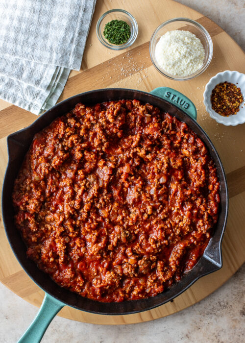 I like to use spicy hot Italian sausage, but if you enjoy things milder feel free to substitute some sweet Italian sausage and limit the amount of red pepper flakes you add.