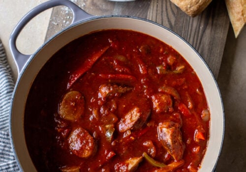 You can make this in a 13×9 baking dish or a 3.6 quart deep cast iron casserole as pictured. Mine is made by Lodge.