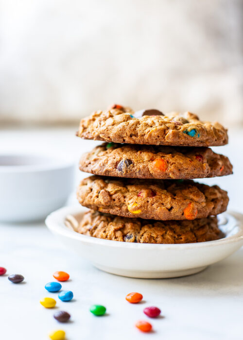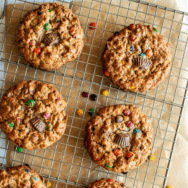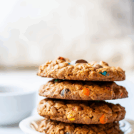 These Oatmeal Peanut Butter Chocolate Candy Cookies are totally EPIC! Hands down one of my favorite cookies ever. They’re stuffed with toasted oats and pecans, peanut butter and two kinds a scrumptious candies, mini M&M’s and mini Reese’s peanut butter cups. They’re absolutely irresistible! And they’re flourless too!
