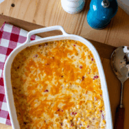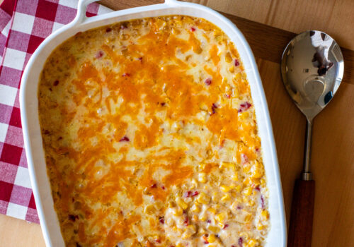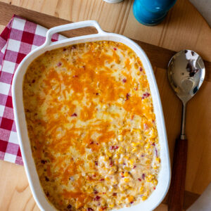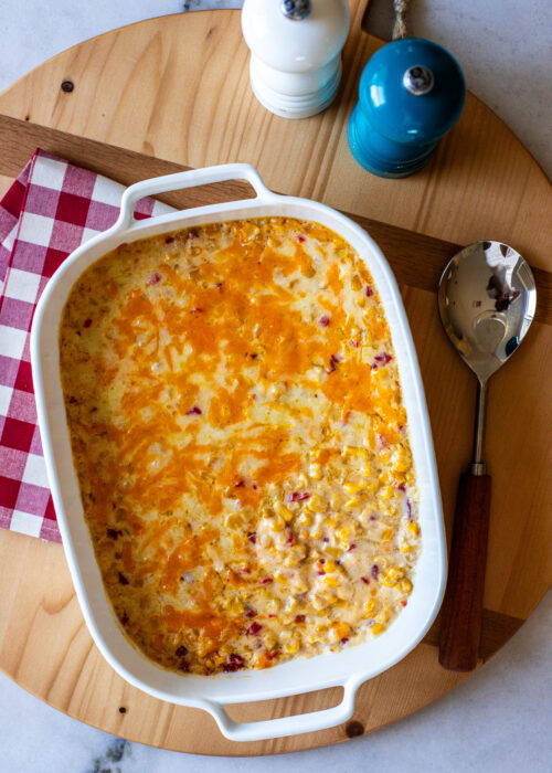 This recipe can be made a day ahead of time. Just cover in foil and refrigerate until the day you’re ready to bake. Remove it from the fridge while your oven preheats. Bake until the corn is bubbly and the cheese is melted.