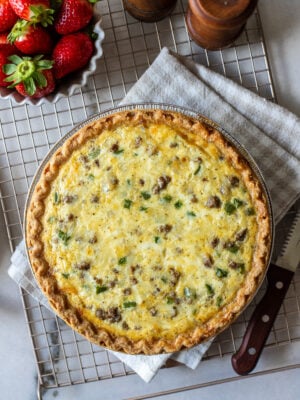 This Sausage Pepper and Onion Quiche is a breakfast, lunch or dinner favorite! It’s super easy to whip up because it’s made with a premade frozen pie crust. The rich, creamy custard and savory filling ingredients make for a delicious, satisfying meal!