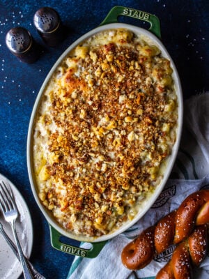 This Philly Cheesesteak Macaroni and Cheese is a hearty pasta dish… Philly style! It’s LOADED with thinly shaved steak, peppers and onions, and topped with Philly soft pretzel crumbs for added flavor. It’s rich and creamy and absolutely decadent!