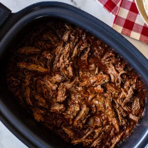 - Remove the meat from the slow cooker, skim off any of the fat on top of the sauce and then shred the meat. I like to shred mine into medium-sized pieces, but you do what you'd prefer, then add the meat back into the slow cooker to keep warm.