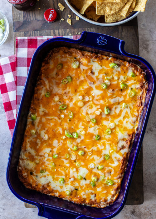 I like to freshly shred my cheeses for this dip so it melts more smoothly. I use a combination of pepper jack and cheddar which we love. If you’re short on time, Southern Living uses packaged Mexican blend cheese in their recipe.