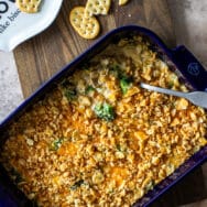 Bake for 10-15 minutes until the cheese is melted and the edges begin to bubble. Place the remaining 4 tablespoons of butter in a microwave-safe bowl. Microwave 20-30 seconds until butter is almost melted. Add your crackers to a Ziploc bag, seal and use your hands to crush the crackers into coarse crumbs. Add the crackers to the melted butter and mix until well coated. Uncover the casserole and sprinkle with the cracker crumbs. Return to the oven and bake for an additional 10-15 minutes until the top is golden brown and the edges are bubbling. Let cool 5 minutes before serving.