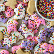 When the dough is done chilling preheat the oven to 350 degrees and line two large baking sheets with parchment paper. Set aside.Remove the top dough from the refrigerator and cut into shapes and place on parchment-lined baking sheet. You'll re-roll the remaining pieces and repeat with the second dough. Place the cutouts on your tray 1-2 inches apart and bake for 9-10 minutes or until just lightly browned around the edges. Let cookies cool on sheet for 5 minutes then remove to wire rack to let completely cool before decorating.