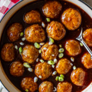 Preheat oven to 400 degrees. Line an extra large baking sheet with parchment paper. Set aside .In a large bowl, combine all ingredients for meatballs and gently mix together. Do not over mix. Use a 1 1/2-inch scooper and scoop meatballs and place on prepared sheet. I like to use a heaping scooper full and I average about 18-20 meatballs.Bake for 15-18 minutes until lightly browned. Remove from oven and add to sauce. Turn the skillet on low and toss the meatballs until they're all nicely coated. Cook until the sauce is warm.I love to garnish the meatballs with sliced green onions and serve top some jasmine rice.