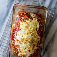 Use your hands, shape mixture into a loaf and place in prepared loaf pan. Bake on the middle rack for 55 minutes. Remove the meatloaf from the oven and top with the remaining 1/2 cup marinara sauce, your shredded mozzarella and a sprinkle of panko. Continue to bake for an additional 10-15 minutes or until meat thermometer registers 155 degrees F. (My loaf took about 65 minutes to reach 155 degrees F)You can drain any of the excess fat from the loaf pan and then let the loaf rest for 10 minutes before slicing and serving.