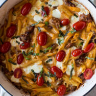 Add your pasta and Italian sausage to a deep oven-safe skillet or a deep cast iron skillet over medium-high heat. Then you'll add your marinara sauce and toss until everything is well coated and cook for a minute or two.