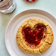 Make a heart-shaped indent using your finger (as shown above). Fill with jam and flatten the edges slightly with your finger. Bake for 18-20 minutes until the edges are lightly browned and puffy. Cool on your baking sheet for 5 minutes or so before removing to a wire rack.