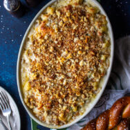 Make your pretzel crumbs by placing pieces of soft pretzel in a food processor. Process until coarse crumbs form. Melt butter in a large skillet over medium heat. Add crumbs and cook for 3-4 minutes, tossing often until lightly browned. Remove from heat.Sprinkle the macaroni and cheese with the leftover cheeses and the pretzel crumbs. Bake for 30 minutes until bubbly and nice and golden browned.