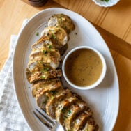 Slice your pork tenderloin and add to a large platter and drizzle some of the peppercorn sauce over the tenderolin if you'd like or you can just serve the sauce on a side in a gravy boat. If you'd like, you can also sprinkle the tenderloin with fresh chopped parsley as a garnish.