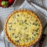 This Sausage Pepper and Onion Quiche is a breakfast, lunch or dinner favorite! It's super easy to whip up because it's made with a premade frozen pie crust. The rich, creamy custard and savory filling ingredients make for a delicious, satisfying meal!
