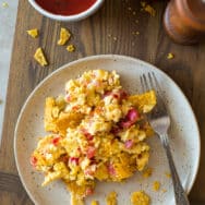 Tex-Mex Migas are a combination of soft scrambled eggs, crushed salty, crunchy corn tortilla chips, tomatoes, green chiles and shredded cheese. It's a delicious way to spice up your breakfast or brunch! It's always a hit with the kiddos too!