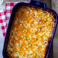 Mix in two cups of your shredded cheese. Pour the mixture into your prepared dish and sprinkle with the remaining cheese. Bake for 25 minutes until the cheese is melted. When you remove it from the oven top it with some sliced scallions. Serve with tortilla chips.